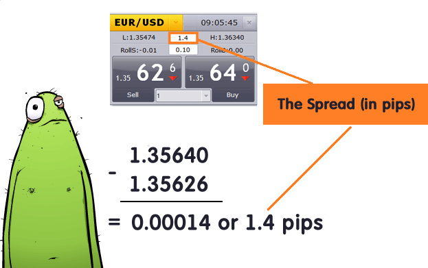 উপরের চিত্র অনুসারে, যদি আপনি EUR/USD কারেন্সি পেয়ারে 1.35640 প্রাইসে একটি বাই এন্ট্রি গ্রহন করেন এবং সেটিকে যদি তাৎক্ষণিক অর্থাৎ 1.35626 প্রাইসে ক্লোজ করে দেন তাহলে আপনার লস এর পরিমাণ হবে 1.4 pips ।